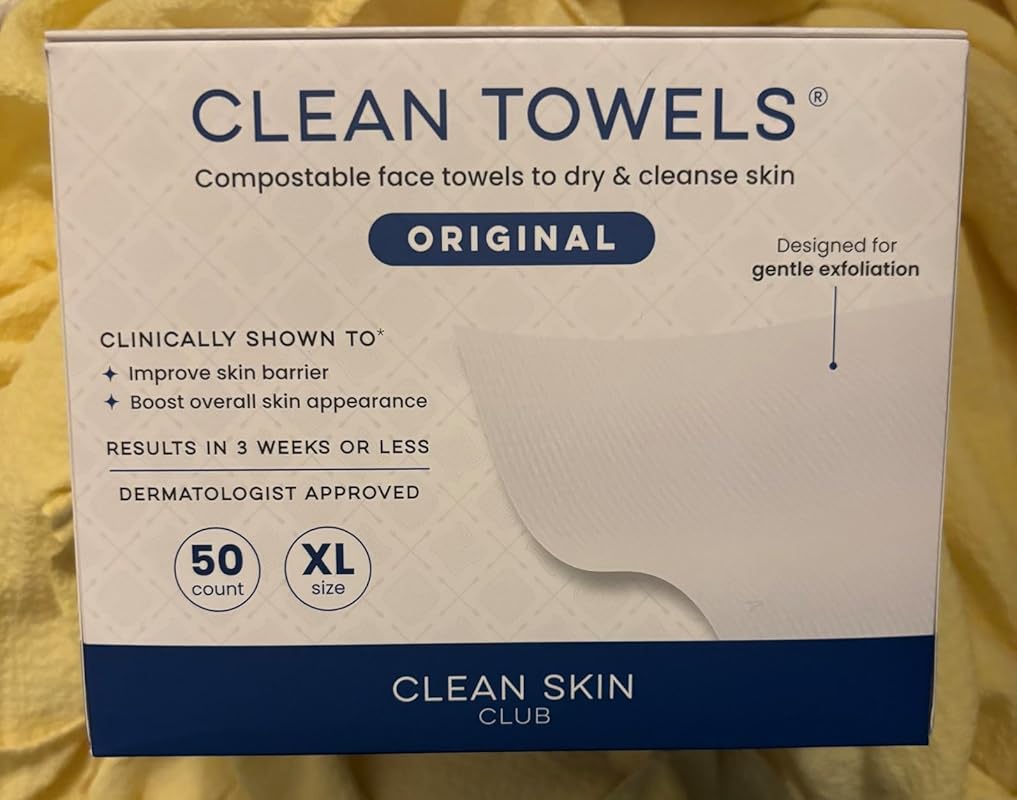 About this item 1 pack of Clean Skin Club ORIGINAL Clean Towels XL for a total of 50 face towels. 50 Single-use, dry facial towels that are dermatologist tested and approved. Clinically shown to help individuals achieve visibly clearer skin, less irritation, and to reduce the appearance of redness. Always have a clean, single use towel to dry your face. Advanced cellulose fiber technology designed to support overall skin health and skin barrier function. Face Towels that are 100% vegan & cruelty free.