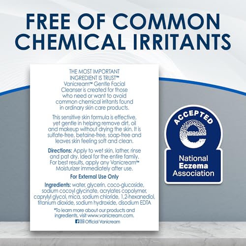 Vanicream Gentle Facial Cleaner, Formulated without Common Irritants for Sensitive Skin Vanicream Gentle Facial Cleanser is our mildest formula designed specifically for daily use on sensitive skin. Helps removes dirt, oil, and makeup without drying or irritating the skin. Unlike traditional facial cleansers, Vanicream leaves your skin feeling clean, soft, and refreshed, never tight. Formulated without common irritants, the cleanser contains no soap, sulfates, gluten, dyes, lanolin, parabens, or formaldehyde releasers. Non-comedogenic, meaning it won’t clog pores. The pH-balanced formula ensures a gentle yet thorough cleanse. Dermatologist-tested and accepted by the National Eczema Association, this gentle formula contains ingredients that are essential components of the skin and benefit all skin types. Apply to wet skin; lather, rinse, and pat dry. For best results, apply any Vanicream Moisturizer (sold separately) after cleansing. Trust Vanicream, the #1 Dermatologist Recommended Brand for Sensitive Skin*, for your family’s skincare needs. With over 50 years of expertise, our primary purpose is to make products for people with sensitive skin. Please note: There are no fragrances or masking fragrances in Vanicream products, but there may be a slightly different aroma to each batch; packaging may vary *Source IQVIA ProVoice Survey, 12 months ending July 2024. Packaging may vary.